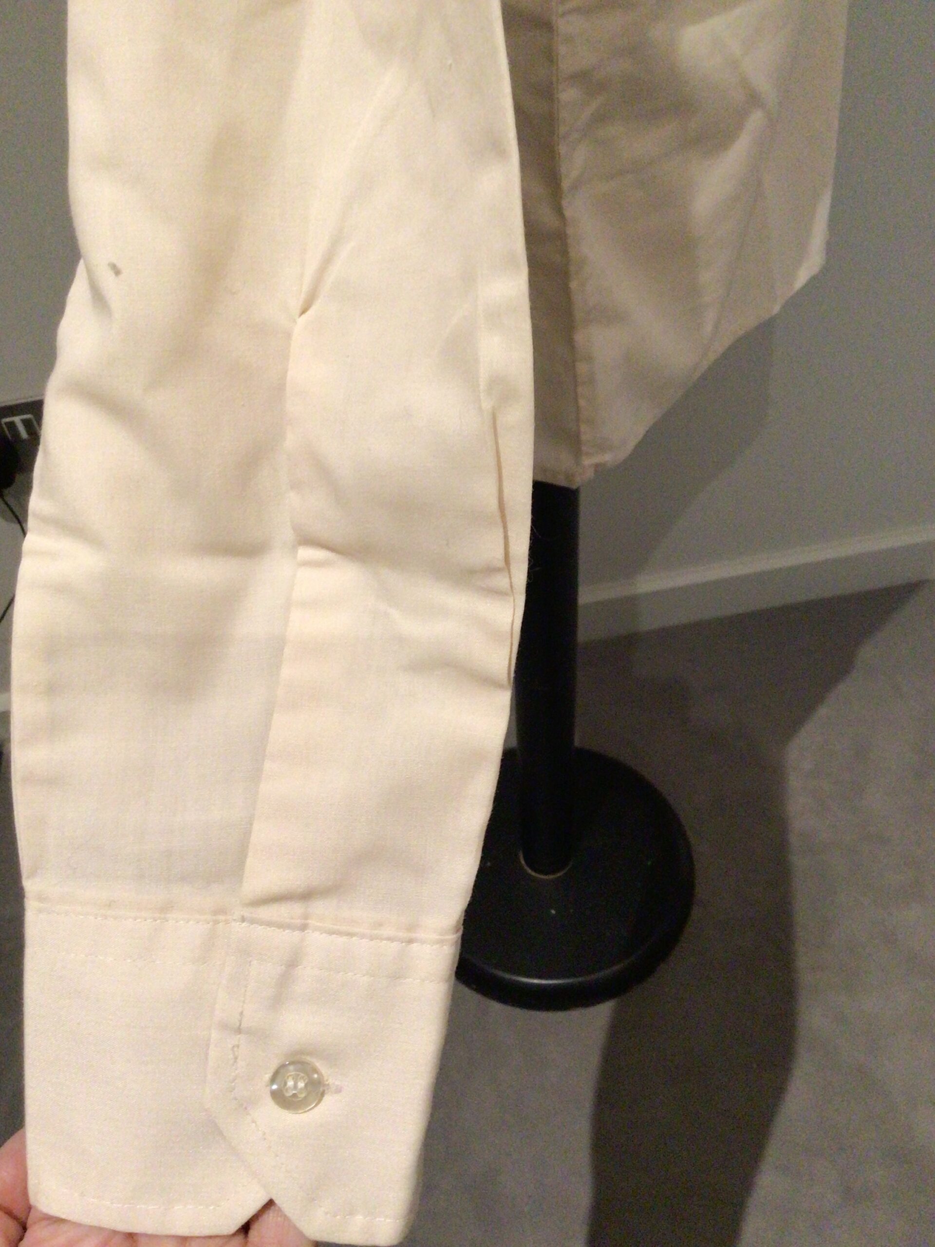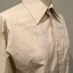 Vintage 80s stone coloured poly/cotton mix shirt, good collar, single button cuffs, straight cut. Machine embroidered panels each side of button placket in white. Cool statement shirt..